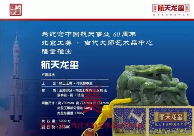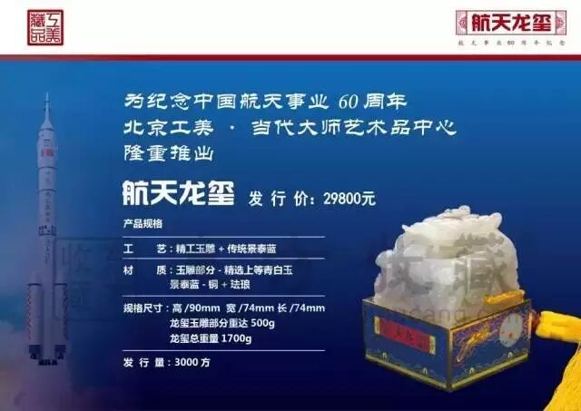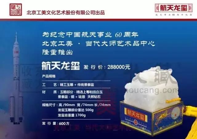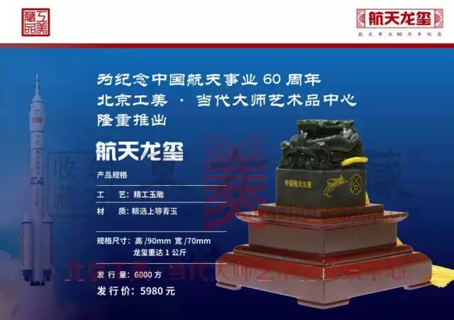 仰望天空,带有中国标志的卫星、火箭等越来越多地翱翔在太空,中国航天事业与共和国的强大发展同行,如今已然屹立于世界民族之林。我国航天事业经历了艰难曲折、波澜壮阔的发展历程,走过了愈加光明的60年。为纪念中国航天事业60周年,北京工美·当代大师艺术品中心隆重推出“航天龙玺”以此铭记中国航天事业的辉煌成就!回顾中国航天史,从“东方红一号”的成功发射,到“嫦娥三号”软着陆,中国航天事业在科学技术落后和工业基础薄弱的困难情况下,从研制导弹和探空火箭起步,到实现发射人造卫星、载人航天、月球探测的跨越,60年来风雨兼程,纪念航天也就是纪念中国科技的进步。玉雕是中国独有的技艺,是中国最古老的雕刻品种之一,具有悠久的发展历史和鲜明的时代特征。景泰蓝又称“铜胎掐丝珐琅”,是北京著名的汉族传统手工艺术品,距今已有600多年的历史,“航天龙玺”将中国最传统的两大工艺完美结合,不仅是历史文化的传承,更是价值的传承体现。“航天龙玺”由北京工美集团出品,中国国防科技工业文化交流协会监制,北京工美属于中国百年老字号的一个代言,它代表着中国工艺美术品最高水平,这是中国工艺美术品的官方制作单位,相当于以前的官方造办,相当于官窑,所以收藏官方更有价值保障。“航天龙玺”由玉雕与景泰蓝两部分合成,是第一枚景玉结合的龙玺,玉雕部分由中国工艺美术大师袁广如精雕细作,景泰蓝部分由中国工艺美术大师霍铁辉精心设计,两位大师从事专业的雕刻及锻造工作数十载,在中国工艺界的地位首屈一指,如今合作,注定龙玺价值非凡。都说藏单不如藏全,回顾北京工美的作品,尚不说太远的已涨成天价的藏品,亚投行国礼《AIIB和玺》四版整套拍出150万元高价的新闻相比很多藏友都已看过。2016年5月31日,在北京万达索菲特大饭店举行了亚投行国礼《AIIB和玺》的拍卖,和玺刚亮相,就有众多买家出价竞拍,随着出价一路升高,出现两位竞买人出价相持不下,且价格持续攀升,你争我抢竞争激烈,最终以150万元高价被神秘藏家买走,获得一片惊艳叫好之声。