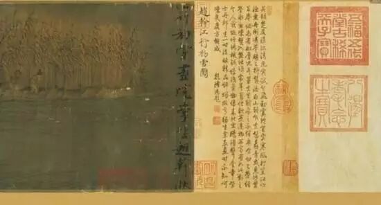 乾隆爷与《富春山居图》的故事说来也有趣儿。乾隆早闻名《富春山居图》大名,可一直未见真颜。正巧从民间收来一副(实为《富春山居图》赝品,现称子明卷),他认为是真迹,大喜,连六下江南也不舍得离身。这位喜好题跋盖印犹如收发室老大爷的皇帝在上面的御题、御跋、御记、御识多达五十五处,密密麻麻满布山巅树梢,把个画卷弄得“满目疮痍,体无完肤”。后来实在无从下笔了,才恋恋不舍地题上“以后展玩亦不复题识矣”。而乾隆十一年(1747),实打实的真卷经沈周、董其昌、安歧等收藏后,流进清宫,乾隆见之也没有“龙颜大悦”,反而认定其为了“赝品”,因祸得福,真迹逃过了被乱涂乱画的命运。