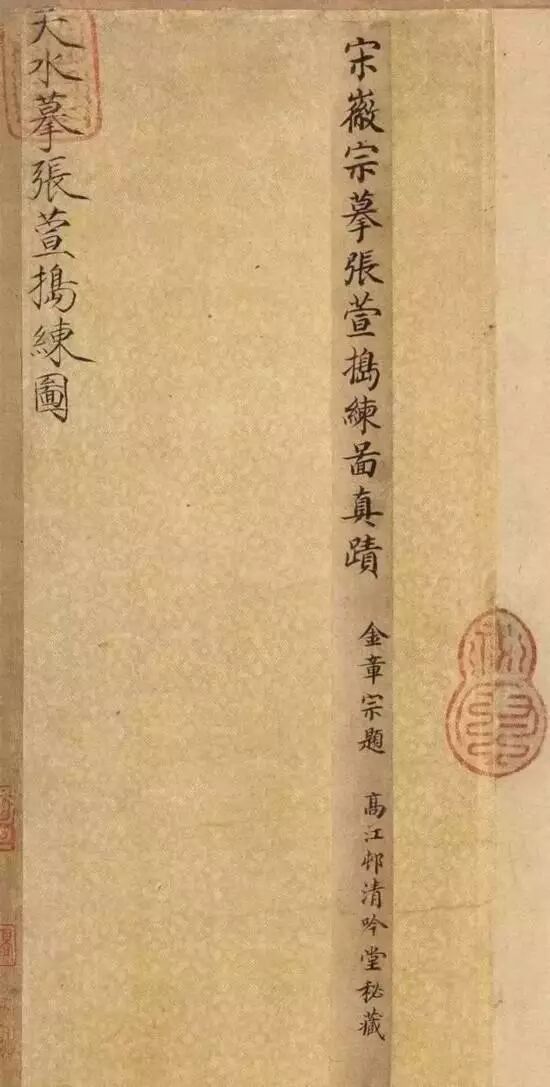 金章宗是一位艺术爱好者,喜爱收藏文物和书画。他收藏的北宋、南宋及以前的书画名迹数不胜数。金章宗善于模仿,他模仿宋徽宗的“瘦金体”几乎可以达到以假乱真的地步。金章宗完颜璟在《捣练图》卷前的隔水细花黄绫上,模仿宋徽宗的瘦金体,写下“天水摹张萱捣练图”八字题签,并盖“明昌七玺”中的七个印章,可见对这幅画的喜爱。