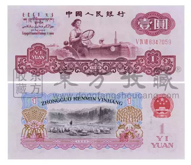 票面正面图案女拖拉机手,正面主色为红色,背面图案为国徽、棉花、梅花、牧场,背面主色为黑色、红色、蓝色、黄色,分古币水印和空心五角星水印两个版别,这是三版币中较珍稀的品种,票面正面图案为拖拉机手,象征农业为基础,背面的羊群象征发展畜牧业。
