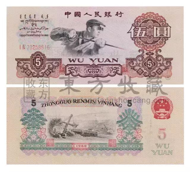 这一张是我国纸币中的精品,主图描绘的是工人手握钢钎,钢钎所指之处,配以放射状底纹,使人仿佛看到了画外炉火通红,钢水四溅,轰轰烈烈的炼钢场面,达到了创作艺术与雕刻艺术的完美结合,堪称绝无仅有的杰作,还赢得了国际钞界“最佳钞票及世界最佳纸币”设计大奖。
