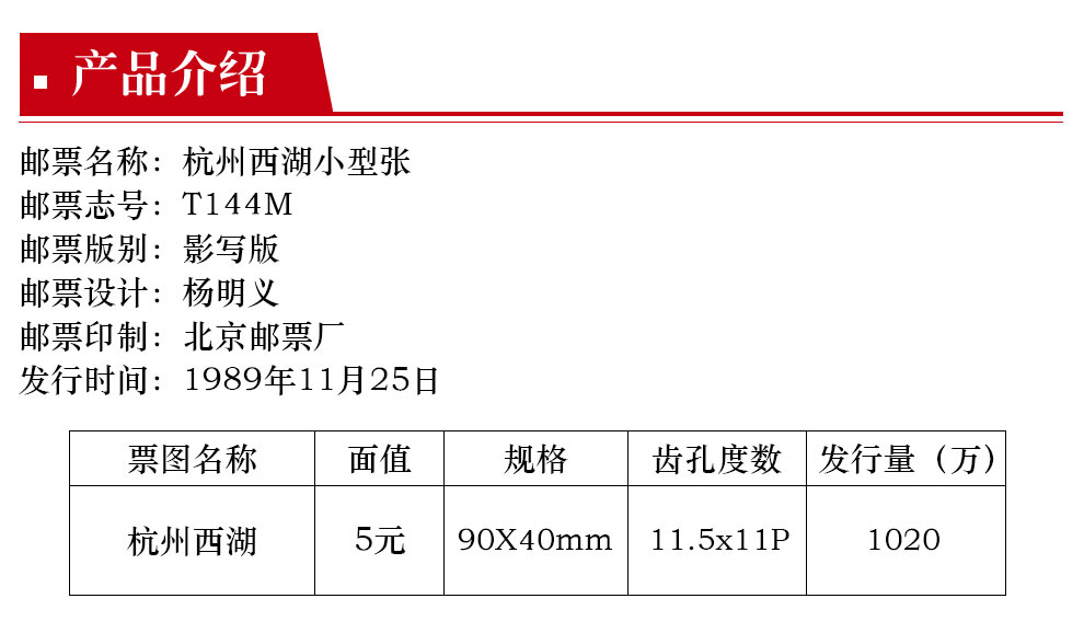T字邮票 T144 杭州西湖邮票 小型张