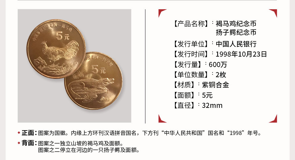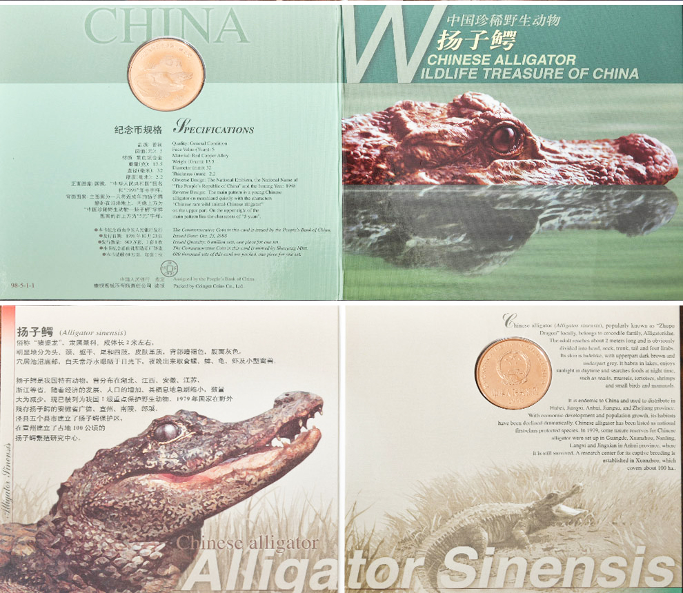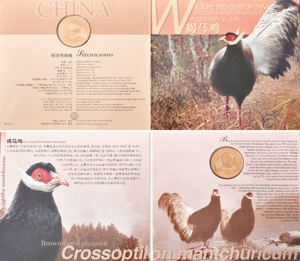中国珍惜野生动物纪念币 1998年扬子鳄、褐马鸡 康银阁装帧版
