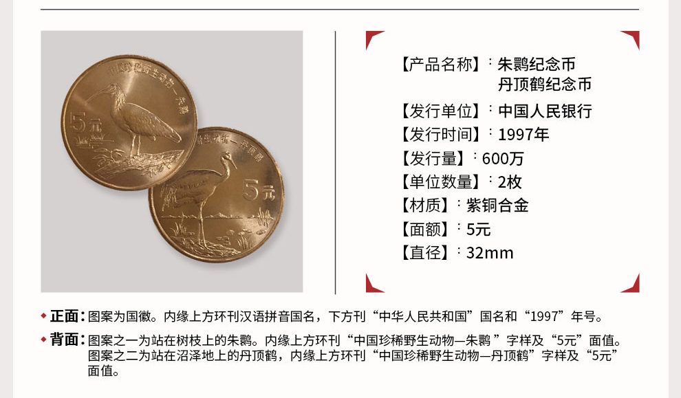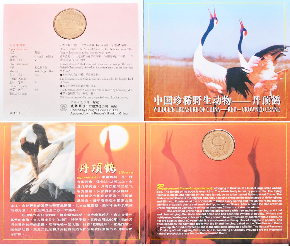 中国珍惜野生动物纪念币 1997年朱鹮、丹顶鹤 康银阁装帧版