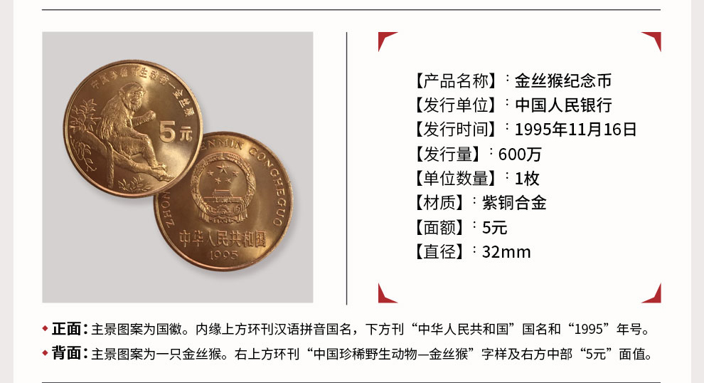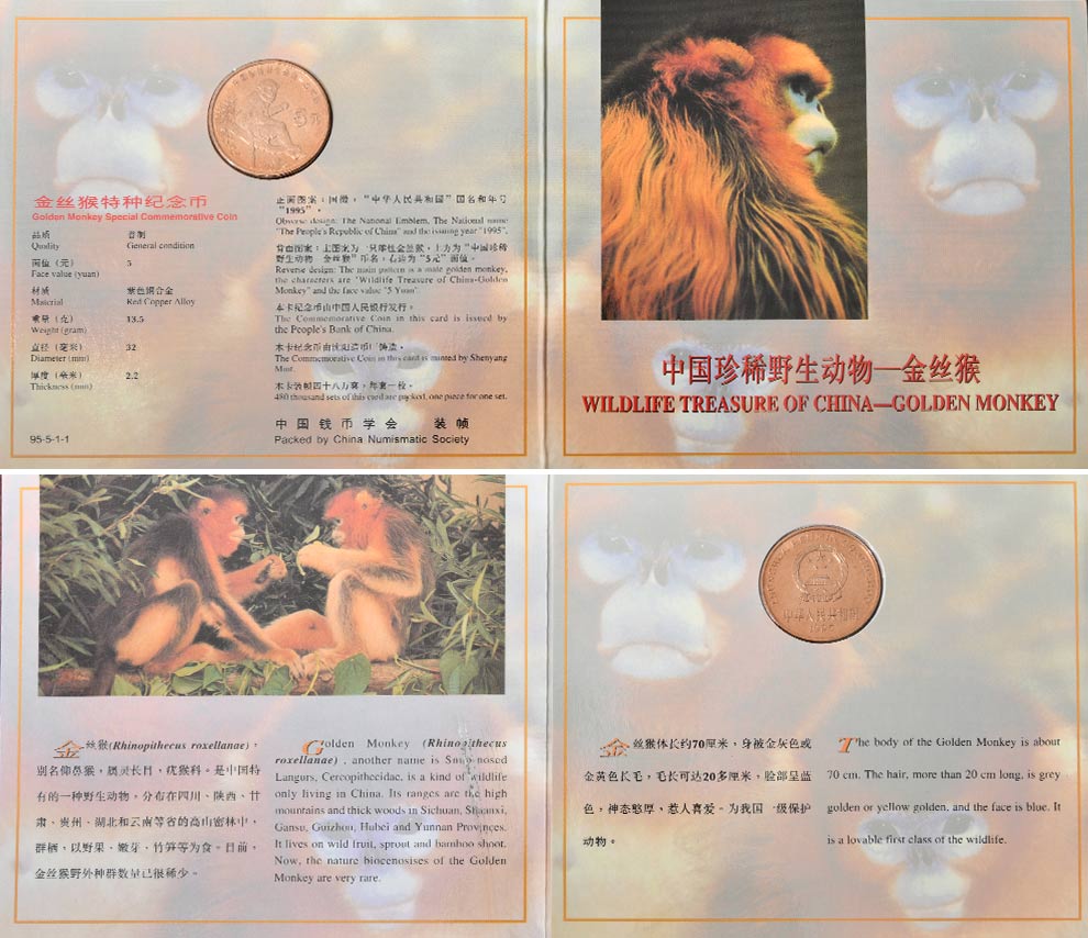 中国珍惜野生动物纪念币 1995年金丝猴 康银阁装帧版